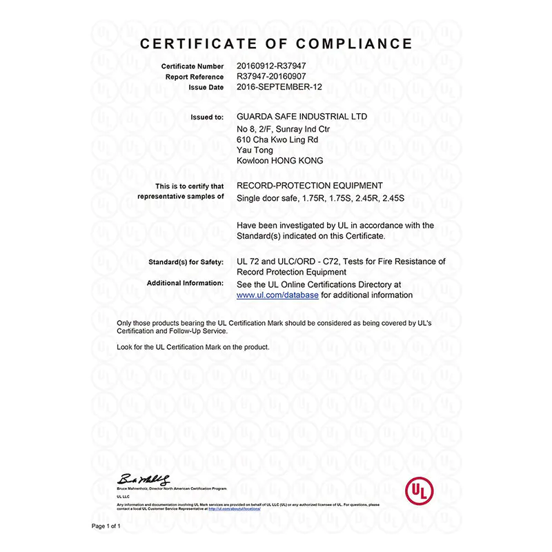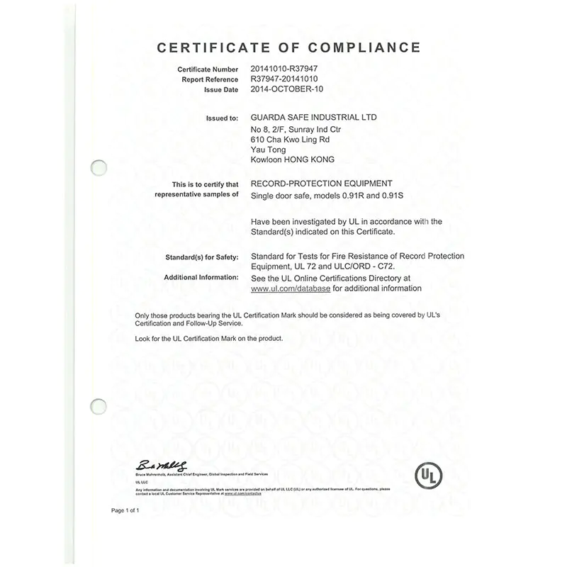 With strong R&D, Guarda holds multiple patents in the PRC, as well as overseas, ranging from invention patents to utility and design patents of all kind on our line of fireproof safe technology. Guarda is a designated High-Tech Enterprise in the PRC. Guarda manufactures to the highest standards and is an UL certified manufacturer. Our designs are aimed at providing consumers with practical and user friendly design that offers the desired protection.